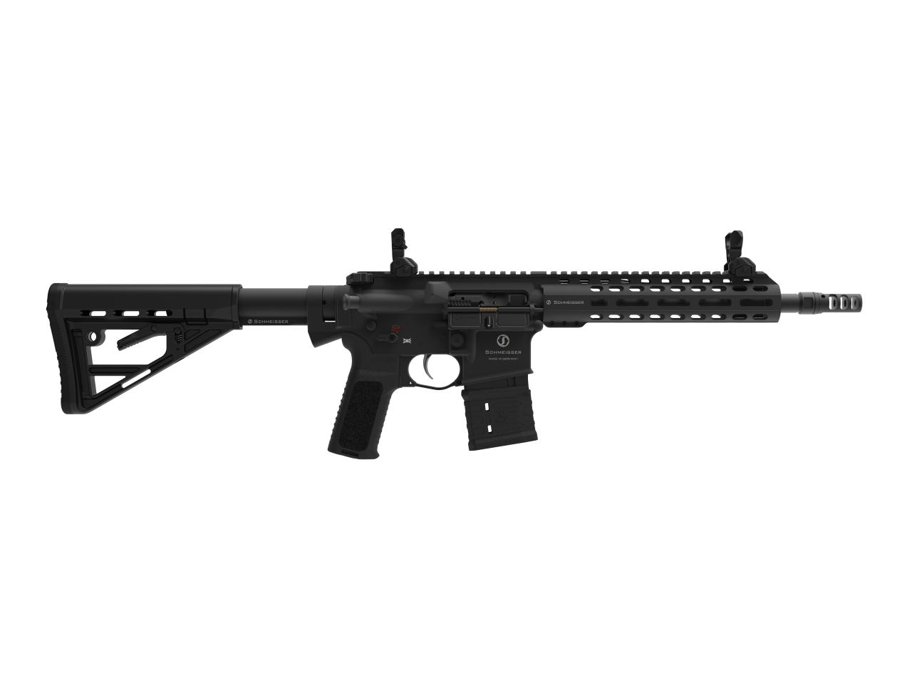 Slim Line M-LOK Vorderschaft, Schubschaft, skelettierter Verschlussträger, Premium Pencil-Matchlauf, NOREC Kompensator, Dynamic Drop-In Trigger, 45/90° Sicherung, voll beidseitig bedienbar, einstellbare Gasabnahme.